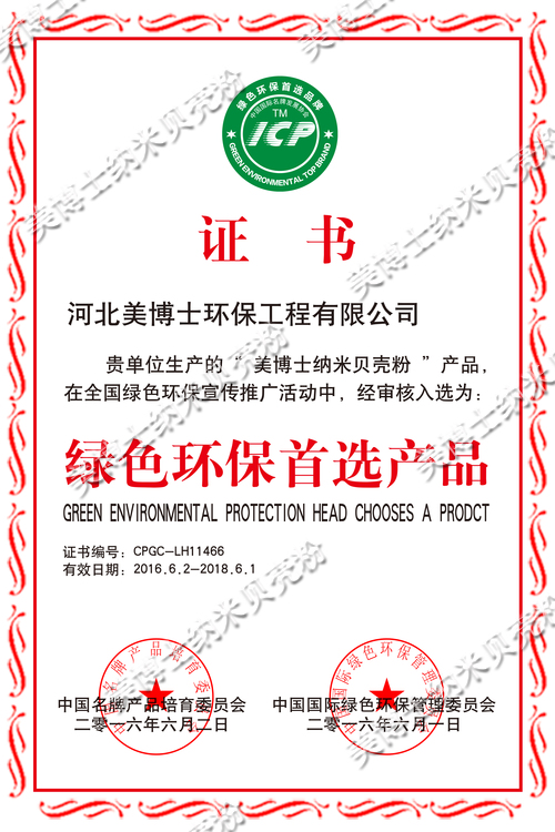 以其得天独厚的优势,河北美博士环保工程有限公司生产的“美博士纳米贝壳粉”产品在全国绿色环保宣传推广活动中,于2016年6月1日和2日经中国名牌产品培育委员会和中国国际绿色环保管理委员会审核入选为绿色环保首选产品,有效期为2016年6月2号至2018年6月1号。
